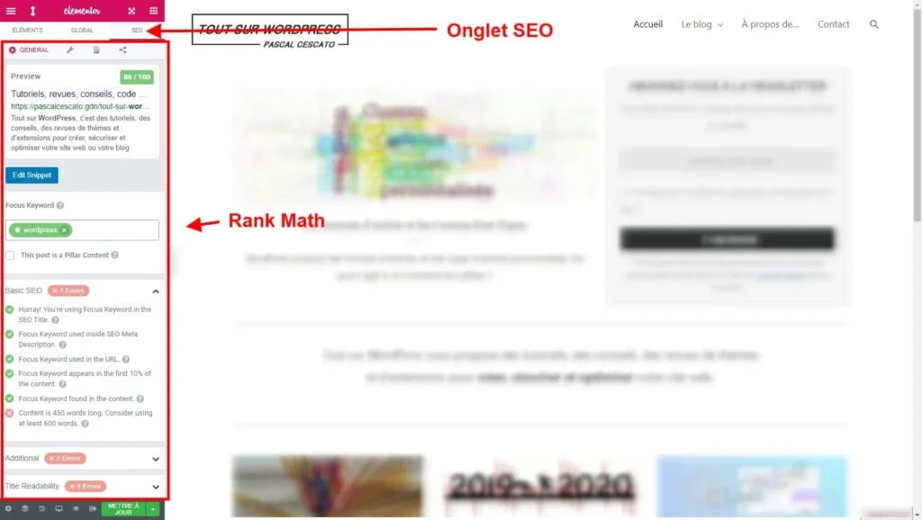 De plus, et c’est une nouveauté qui n’a pas son pendant dans les autres extensions SEO, il est maintenant possible d’optimiser une page créée avec Elementor depuis Elementor, et ça, c’est magique !