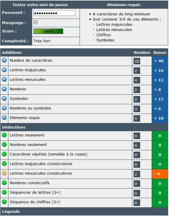 Bon, je ne me suis pas inquiété outre mesure, mon mot de passe… avant qu’un hacker le casse, de l’eau aura coulé sous les ponts. Sauf à avoir une chance de cocu ;) mais ça, c’est son problème, pas le mien :D Pour info, je crée mes mots de passe faciles à mémoriser, mais pas à trouver, du genre C10fi6l@KC100&C ou 7.1Po6Bl@TrouV. Vous pouvez le tester sur Under News↗ - voici le résultat du test de mon mot de passe actuel (je le change au gré de mes découvertes mnémotechniques) :