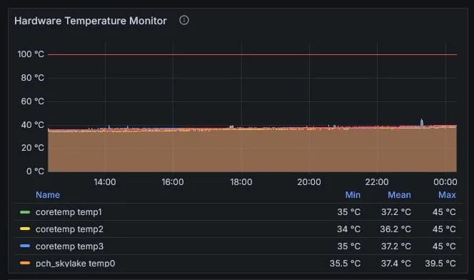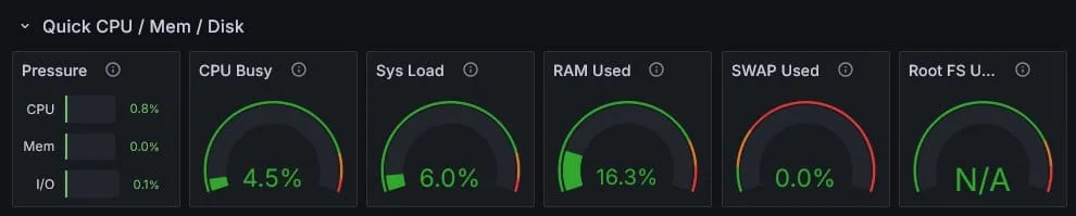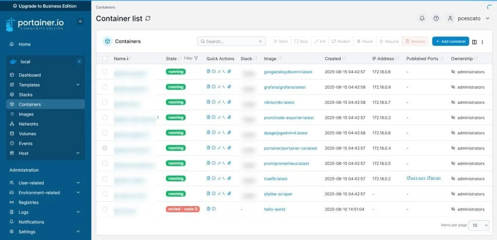 Aujourd’hui, mon petit serveur fait tourner une dizaine de services en continu, surveille mes applications, héberge mes projets en phase de test, et tout cela sans débourser un centime supplémentaire. Et il tient la charge, avec une stack correcte (Traefik, Portainer, AlloyDB Omni, n8n, Prometheus, Grafana, node importer…) :