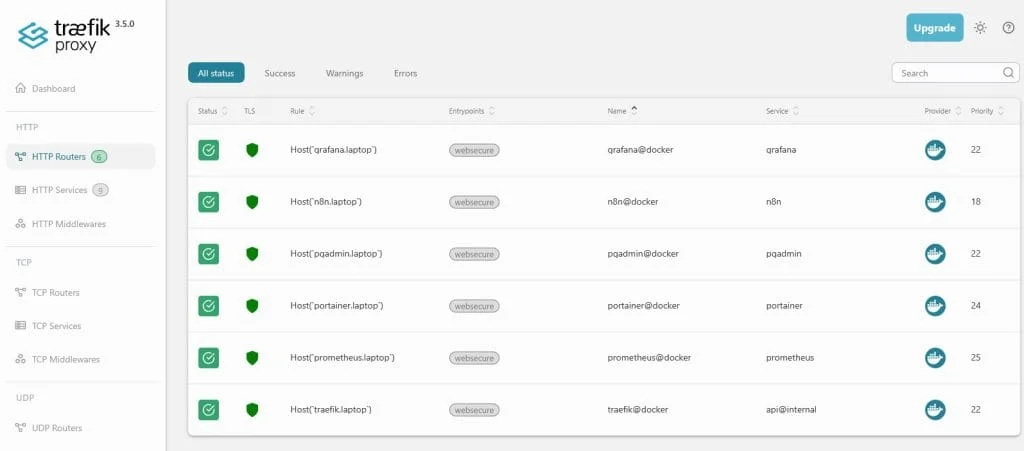 services:traefik:image: traefik:latestcontainer_name: traefikcommand:- "--configFile=/traefik.yml"ports:- "80:80"- "443:443"labels:- "traefik.enable=true"- "traefik.http.routers.traefik.rule=Host(`traefik.localhost`)"- "traefik.http.routers.traefik.entrypoints=websecure"- "traefik.http.routers.traefik.tls=true"- "traefik.http.routers.traefik.service=api@internal"volumes:- /var/run/docker.sock:/var/run/docker.sock:ro- ./traefik.yml:/traefik.yml:ro- ./certs:/certs:ronetworks:- webrestart: unless-stoppedportainer:image: portainer/portainer-ce:latestcontainer_name: portainerlabels:- "traefik.enable=true"- "traefik.http.routers.portainer.rule=Host(`portainer.localhost`)"- "traefik.http.routers.portainer.entrypoints=websecure"- "traefik.http.routers.portainer.tls=true"volumes:- /var/run/docker.sock:/var/run/docker.sock- portainer_data:/datanetworks:- webrestart: unless-stoppedprometheus:image: prom/prometheus:latestcontainer_name: prometheuslabels:- "traefik.enable=true"- "traefik.http.routers.prometheus.rule=Host(`prometheus.localhost`)"- "traefik.http.routers.prometheus.entrypoints=websecure"- "traefik.http.routers.prometheus.tls=true"volumes:- ./prometheus.yml:/etc/prometheus/prometheus.yml:ro- prometheus_data:/prometheusnetworks:- webrestart: unless-stoppedgrafana:image: grafana/grafana:latestcontainer_name: grafanaenvironment:- GF_SECURITY_ADMIN_USER=admin- GF_SECURITY_ADMIN_PASSWORD=changeme123labels:- "traefik.enable=true"- "traefik.http.routers.grafana.rule=Host(`grafana.localhost`)"- "traefik.http.routers.grafana.entrypoints=websecure"- "traefik.http.routers.grafana.tls=true"volumes:- grafana_data:/var/lib/grafananetworks:- webrestart: unless-stoppedvolumes:portainer_data:prometheus_data:grafana_data:networks:web:external: falseTu remarques que dans ce fichier, il y a toute une section dédiée à Traefik, et qu’ensuite, on le retrouve pour exposer tous les services auxqueks on accède via un navigateur. Mais il faut avant passer par…