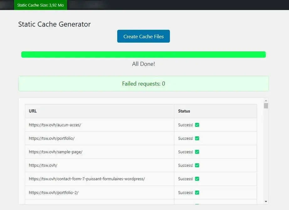 Une fois la configuration terminée, rendez-vous à Server Static > Cache generator dans le menu latéral gauche de l’administration et cliquez sur le bouton “Create Cache Files”, les fichiers statiques seront générés.