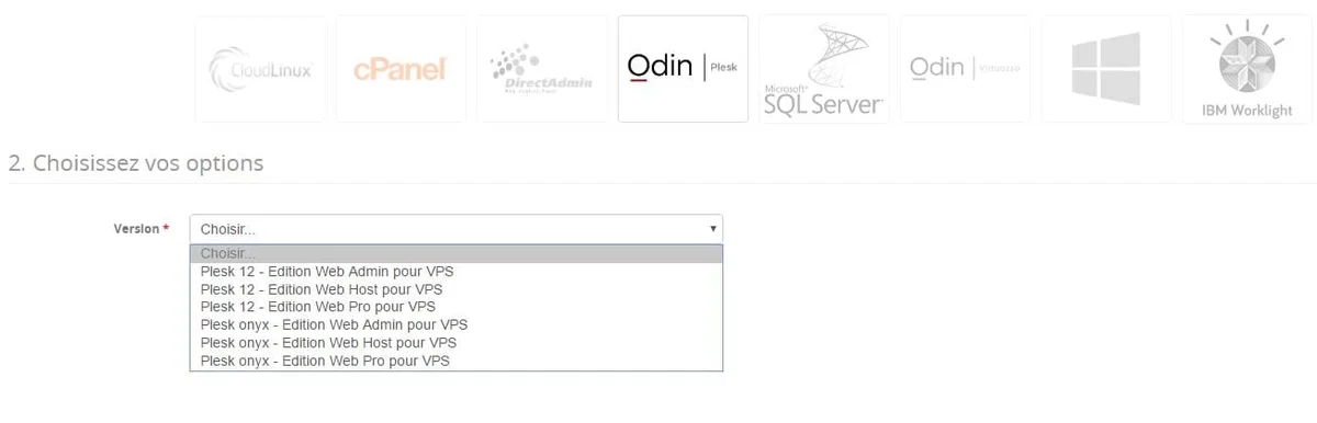 … puis le type de licence à commander (je vous recommande d’opter pour Plesk Obsidian, la dernière version) :