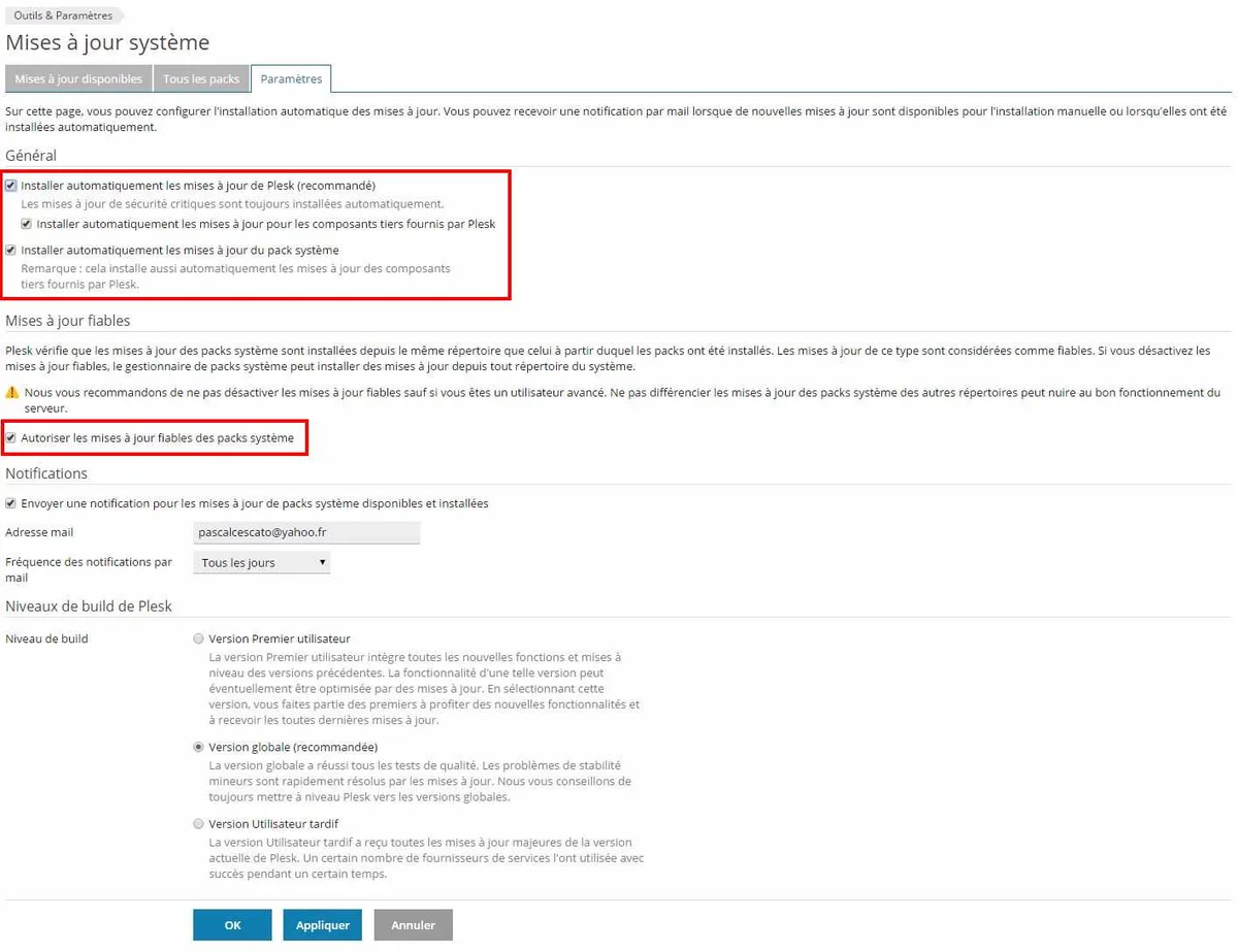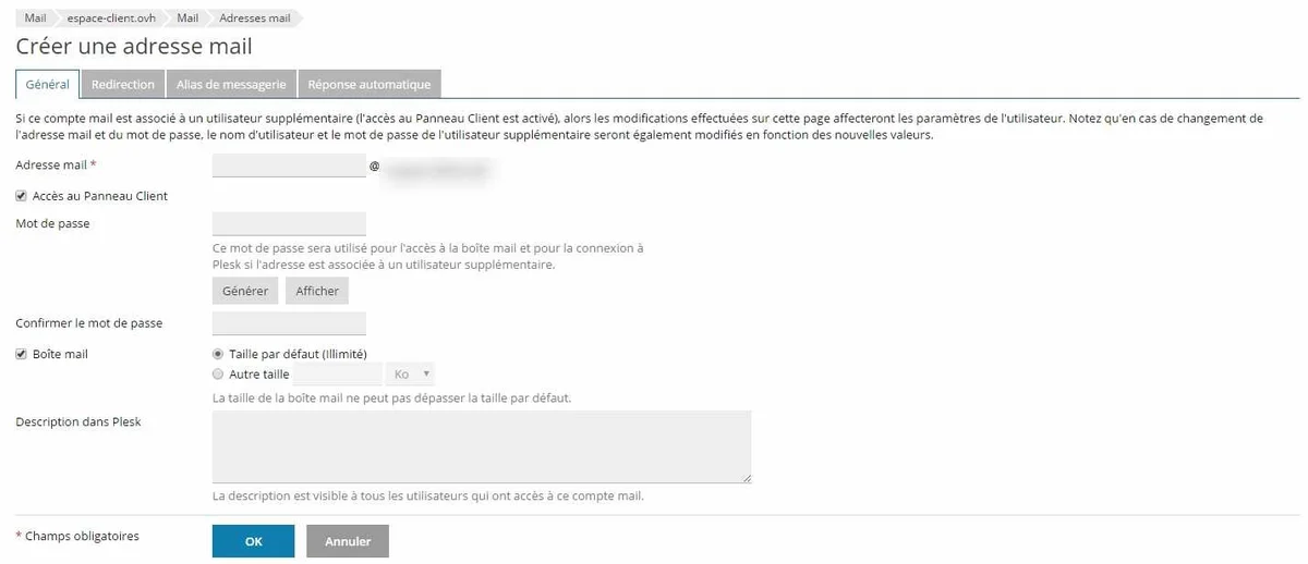 Ces réglages vaudront pour tous les comptes de messagerie que vous créerez via l’interface Plesk.