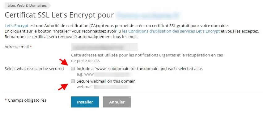 Cliquez sur Let’s Encrypt (6). Sécurisez le domaine principal, l’alias générique (www) et le client de messagerie en ligne. Cliquez sur Installer - voilà, c’est terminé côté serveur.