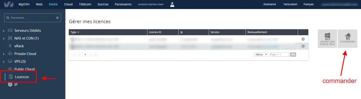 Que vous ayez à payer ou non pour la licence, il vous faudra la commander. Rendez-vous dans votre interface OVH, cliquez sur Dédié ou sur Cloud (barre de menu) puis sur Licences (menu latéral à gauche).