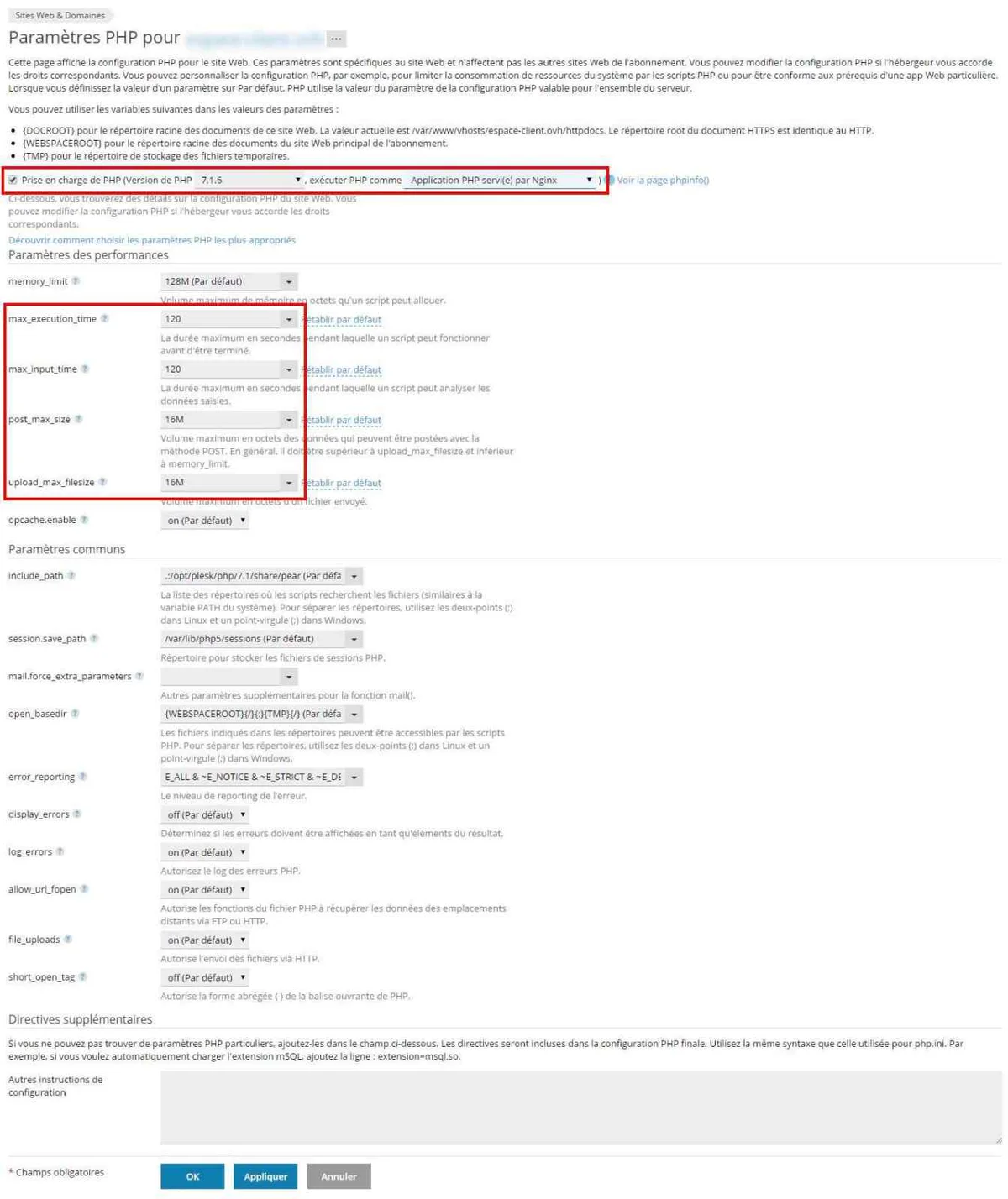 Après avoir sélectionné Application PHP servie par Nginx, ajustez les valeurs dans Paramètres des performances. Validez en cliquant sur OK.
