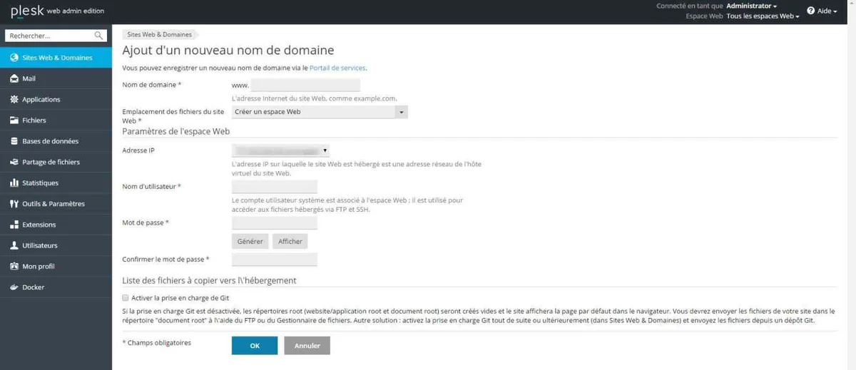 Plesk permet de générer automatiquement un mot de passe fort pour les utilisateurs (domaine, base de données, email). Si vous utilisez ce générateur, veillez à afficher votre mot de passe avant de valider. Vous aurez sinon à le changer - et à l’afficher illico.