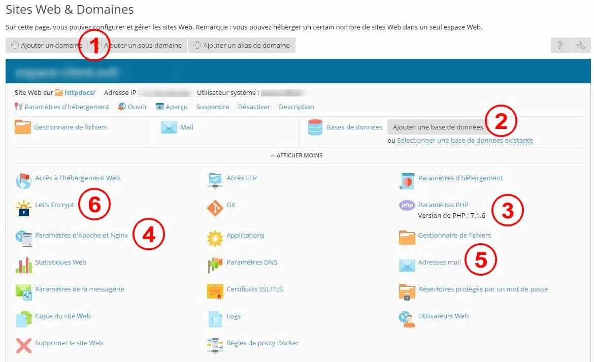 Pour accéder à la base de données que vous venez de créer, cliquez sur Base de données (à gauche du point 2 - capture d’écran “Configuration de l’hébergement”).